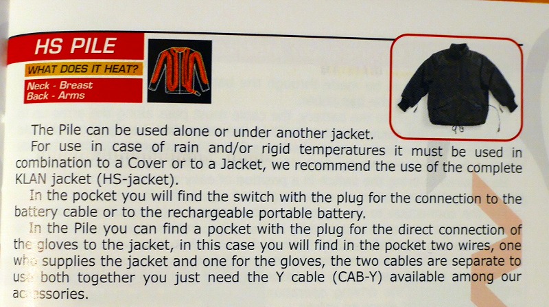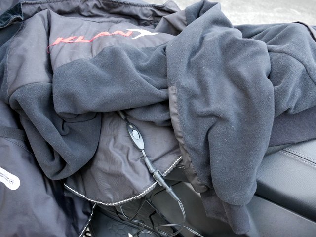 更に、このヘラープラグからはイタリアのバイクアクセサリーブランドKLANの電熱ウェアへの電源供給もできる。この電熱ジャケットは長袖で袖まで電熱線が入っており、非常に暖かい。