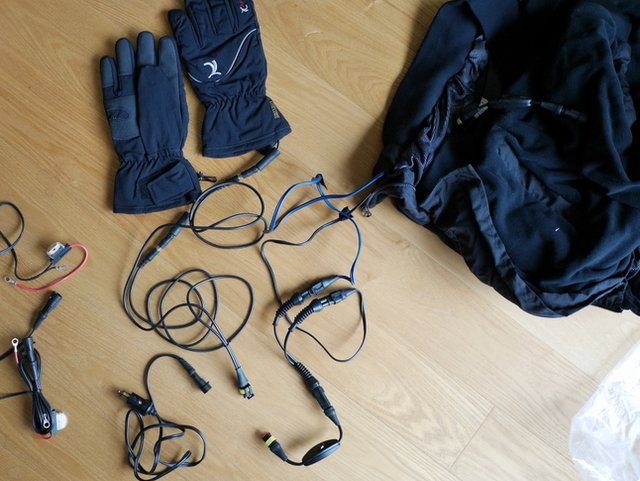 KLANの電熱ジャケットの各種ケーブルと電熱手袋