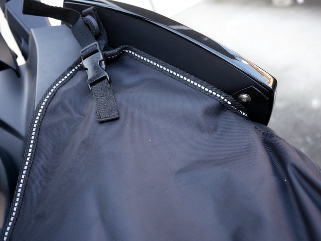 バイク下部の溝にフックをかけて更にレッグカバーをしっかりバイクに固定し取り付けは完了である。