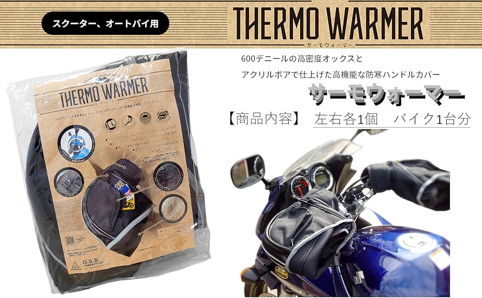 冬季においては、ツーリングの有無にかかわらずハンドルカバー(ハンドルウォーマー)は必須の装備である。大阪繊維資材のハンドルカバーは作りが丈夫で耐久性も高く、長期間使用できるため、車種を問わずこのメーカーの製品を愛用している。